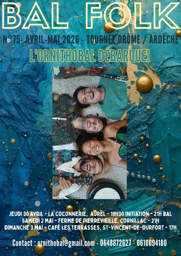 Venez découvrir ce tout nouveau café, au bord de l'Eyrieux et de la voie cyclable Dolce Via, à l'occasion du concert de l'Ornithobal, quatuor, ou parfois trio de musicien.nes offrant une musique surée, délicatement dansante! Des compositions aux arrangements subtils, mélange de clarinettes et de fl… source: [Bal Folk au bord de l'Eyrieux - AgendaTrad](https://agendatrad.org/e_2026-05/bal-folk-au-bord-de-eyrieux.759bgp6m)
